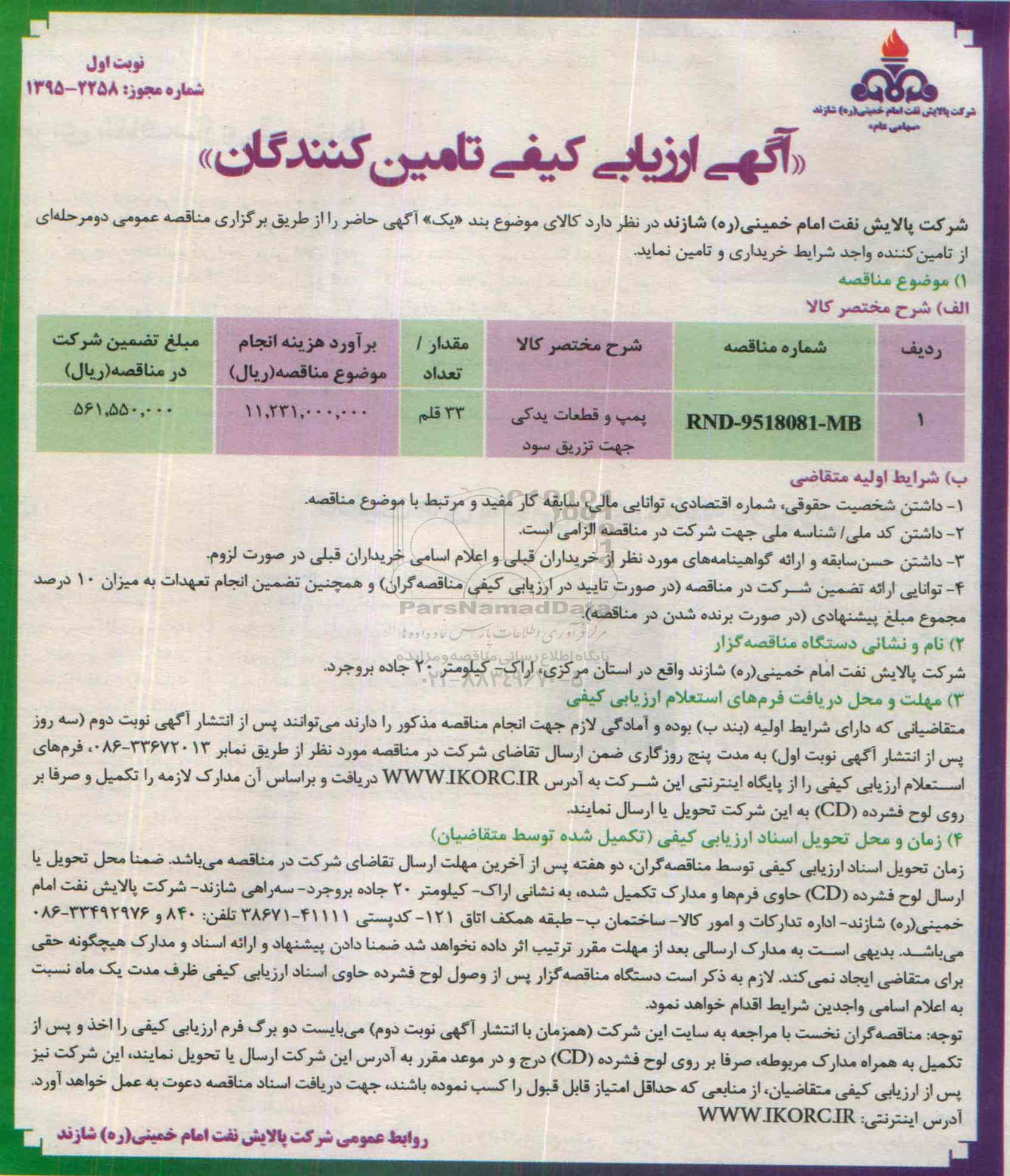 ارزیابی کیفی پمپ و قطعات یدکی جهت تزریق سود از کلیه افراد متخصص و شرکتها واجد شرایط دعوت به عمل میآید در مناقصه با کد خبرگزاری پارس نماد: 713413 شرکت نمایند.