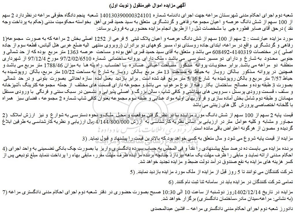 شعبه دوم اجرای احکام مدنی شهرستان مراغه جهت اجرای دادنامه شماره 140130390000324101 شعبه  پنجم دادگاه حقوقی مراغه درنظردارد 2 سهم از 100 سهم از شش دانگ عرصه و اعیان مجموعه رفاهی و گردشگری  متعلق به سید حمید قمری آهق  بخواسته محکومیت مدنی (حکم به پرداخت وجه نقد ) درحق آقای صابر فطوره چی  با مشخصات ذیل را ازطریق انجام مزایده حضوری به فروش برساند: