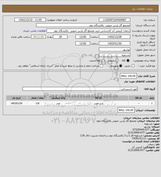 نام دستگاه خریدار:مجتمع گاز پارس جنوبی پالایشگاه دوم