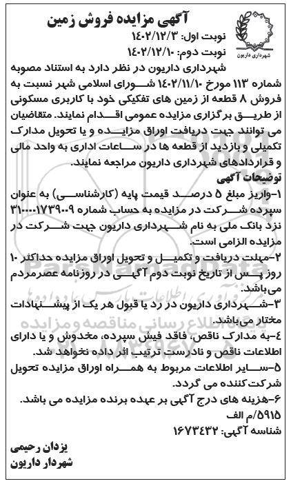 مزایده فروش 8 قطعه از زمین های تفکیکی با کاربری مسکونی