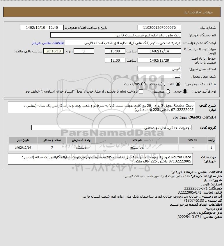 شرح کلی نیاز: Router Cisco تحویل 3 روزه - 20 روز کاری مهلت تست کالا به شرط نو و پلمپ بودن و دارای گارانتی یک ساله (تماس : 07132222005 داخلی 225 آقای ملکی)
