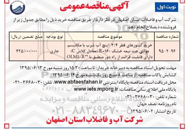 شرکت آب و فاضلاب استان اصفهان در نظر دارد از طریق مناقصه خرید ذیل را مطابق جدول زیر از فروشنده ذیصلاح انجام دهد.