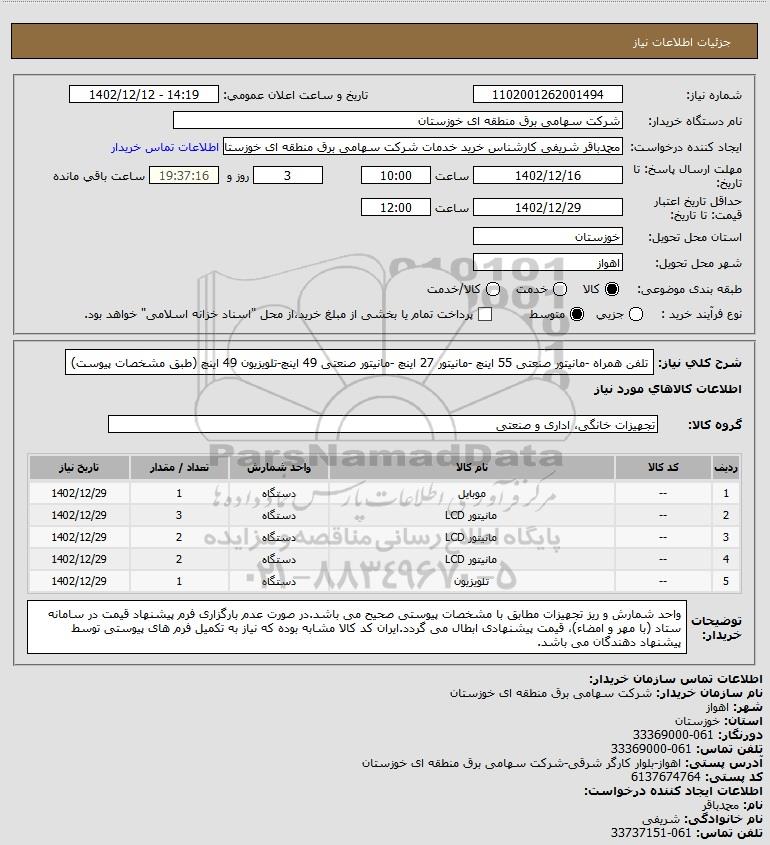 شرح کلی نیاز: تلفن همراه -مانیتور صنعتی 55 اینچ -مانیتور 27 اینچ -مانیتور صنعتی 49 اینچ-تلویزیون 49 اینچ (طبق مشخصات پیوست)