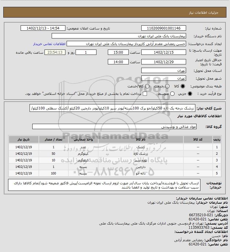 استعلام زرشک درجه یک تازه 50کیلو/جو پرک 100بسته/پودر سیر 10کیلو/پودر دارچین 20کیلو /کشک سطلی 100کیلو/, استعلام زرشک درجه یک تازه 50کیلو/جو پرک 100بسته/پودر سیر 10کیلو/پودر دارچین 20کیلو /کشک سطلی 100کیلو/