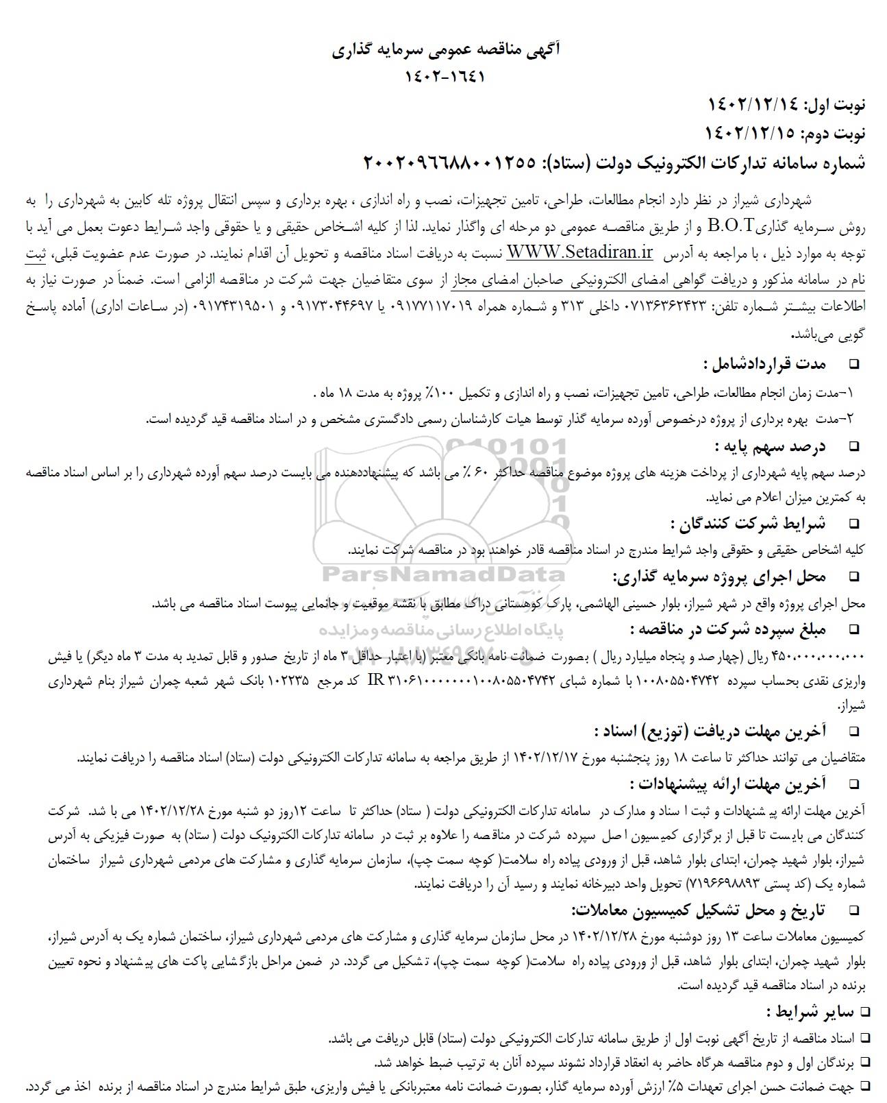 شهرداری شیراز در نظر دارد انجام مطالعات، طراحی، تامین تجهیزات، نصب و راه اندازی، بهره برداری و سپس انتقال پروژه تله کابین به شهرداری را به روش سرمایه گذاری B.O.T و از طریق مناقصه عمومی دو مرحله ای واگذار نماید. لذا از کلیه اشخاص حقیقی و یا حقوقی واجد شرایط دعوت بعمل می آید با توجه به موارد ذیل با مراجعه به آدرس ستاد ایران نسبت به دریافت اسناد مناقصه و تحویل آن اقدام نمایند. در صورت عدم عضویت قبلی ثبت نام در سامانه مذکور و دریافت گواهی امضای الکترونیکی صاحبان امضای مجاز از سوی متقاضیان جهت شرکت در مناقصه الزامی است. ضمنا در صورت نیاز به اطلاعات بیشتر شماره تلفن 07136362423 داخلی 313 و شماره همراه 09177117019 یا 09173044697 و 09174319501 (در ساعات اداری) آماده پاسخ گویی می باشد.