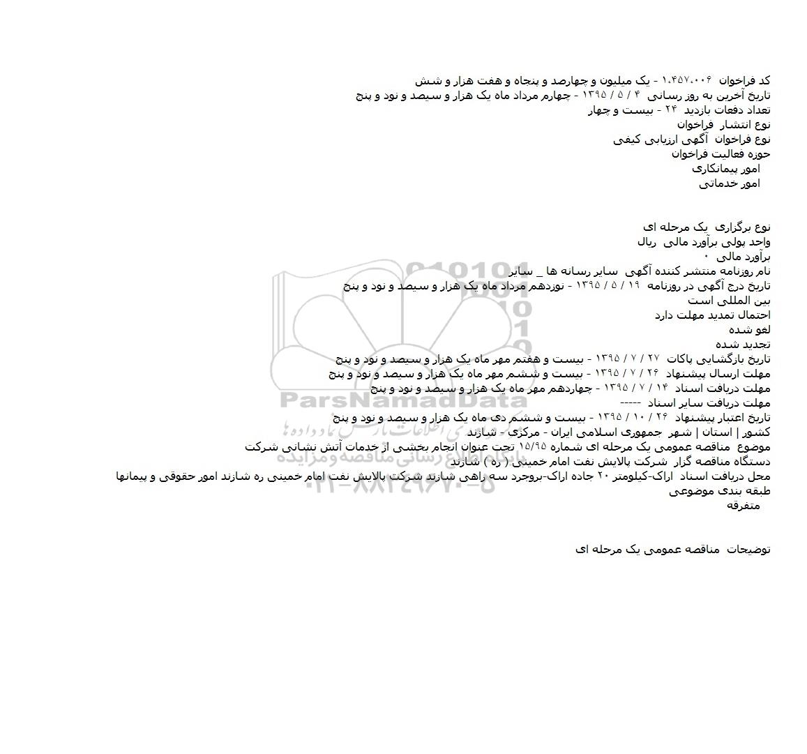 محل دریافت اسناد اراک-کیلومتر ۲۰ جاده اراک-بروجرد سه راهی شازند شرکت پالایش نفت امام خمینی ره شازند امور حقوقی و پیمانها