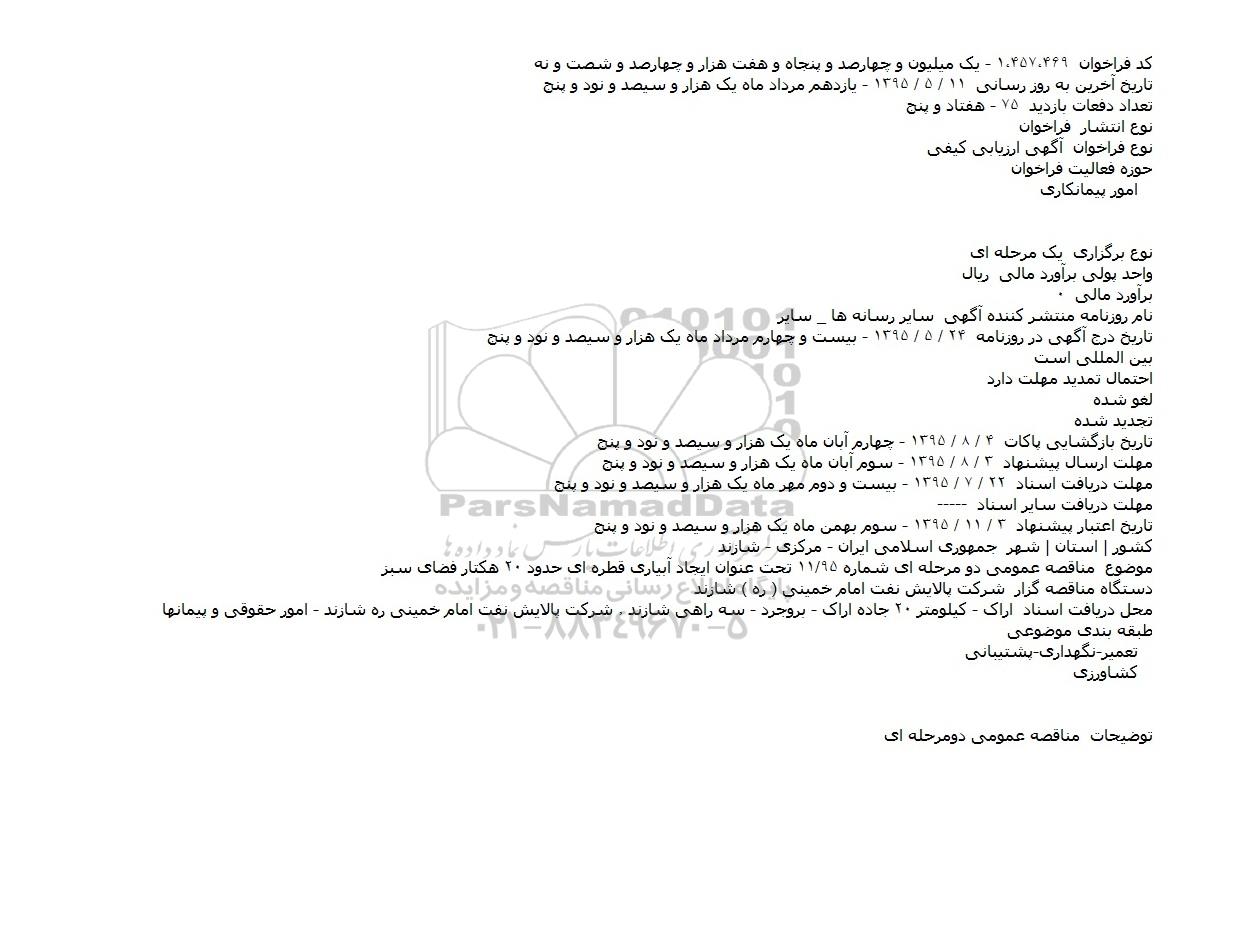 موضوع  مناقصه عمومی دو مرحله ای شماره ۱۱/۹۵ تحت عنوان ایجاد آبیاری قطره ای حدود ۲۰ هکتار فضای سبز