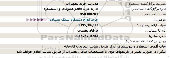 استعلام بها و موضوع استعلام استعلام خرید انواع دستگاه سنگ سنباده به اطلاع کلیه شرکتها و افراد متخصص واجد شرایط میرساند، آگهی گذار در نظر دارد از طریق استعلام بها، نسبت به انتخاب و دریافت پیشنهادات اقدام نماید. این استعلام با کد آگهی ثبت شده در سامانه خبرگزاری پارس نماد : 715167 منتشر شده است. مشخصات استعلام : تاریخ شروع استعلام: 1395/06/04 آخرین مهلت ارسال پیشنهاد قیمت : 1395/06/13 و محل اجرای پروژه : استان اصفهان میباشد. استعلام قیمت مورد درخواست : استعلام خرید انواع دستگاه سنگ سنباده با دستهبندیهای تخصصی و گروه های مرتبط : ابزار و یراق آلات, استعلام اطلاع رسانی میگردد.