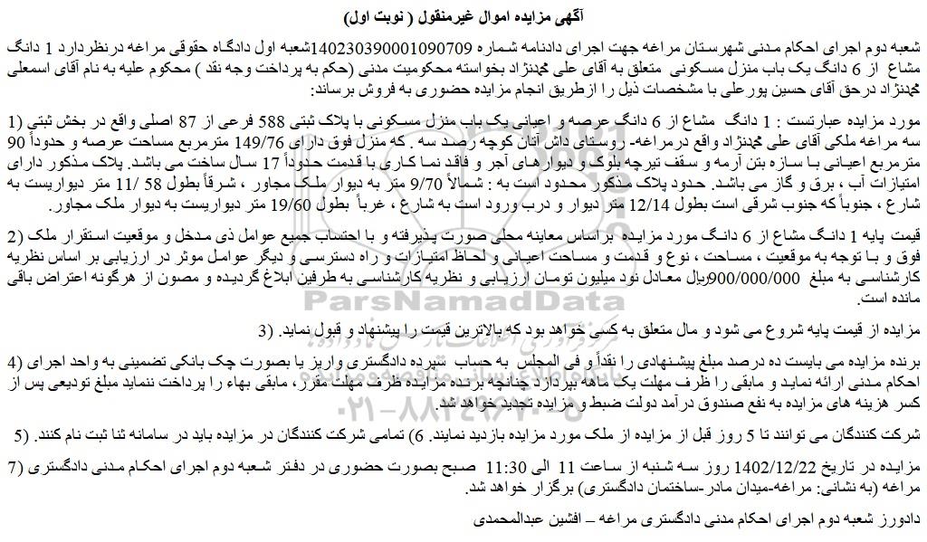 شعبه دوم اجرای احکام مدنی شهرستان مراغه جهت اجرای دادنامه شماره 140230390001090709شعبه اول دادگاه حقوقی مراغه درنظردارد 1 دانگ مشاع  از 6 دانگ یک باب منزل مسکونی  متعلق به آقای علی محمدنژاد بخواسته محکومیت مدنی (حکم به پرداخت وجه نقد ) محکوم علیه به نام آقای اسمعلی محمدنژاد درحق آقای حسین پورعلی با مشخصات ذیل را ازطریق انجام مزایده حضوری به فروش برساند: