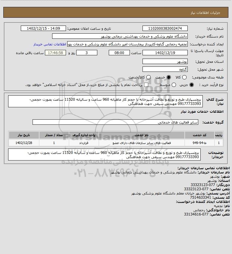 شرح کلی نیاز: برونسپاری طبخ و توزیع و نظافت آشپزخانه با حجم کار ماهیانه 960 ساعت و سالیانه 11520 ساعت بصورت حجمی- 09177733393 مهندس سیفی جهت هماهنگی