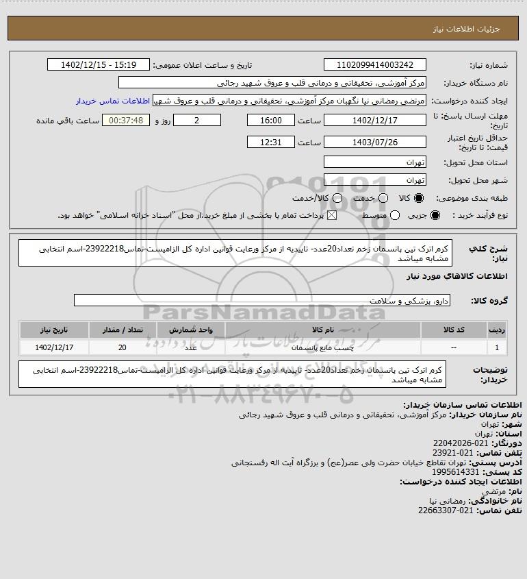 شرح کلی نیاز: کرم اترک تین پانسمان زخم تعداد20عدد- تاییدیه از مرکز ورعایت قوانین اداره کل الزامیست-تماس23922218-اسم انتخابی مشابه میباشد