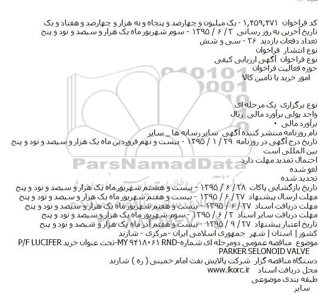 موضوع  مناقصه عمومی دومرحله ای شماره RND-۹۴۱۸۰۶۱-MY تحت عنوان خرید P/F LUCIFER PARKER SELONOID VALVE