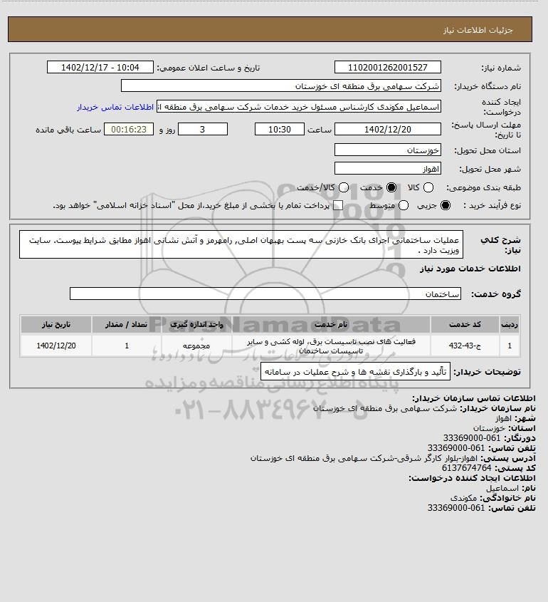شرح کلی نیاز: عملیات ساختمانی اجرای بانک خازنی سه پست بهبهان اصلی, رامهرمز و آتش نشانی اهواز مطابق شرایط پیوست. سایت ویزیت دارد .