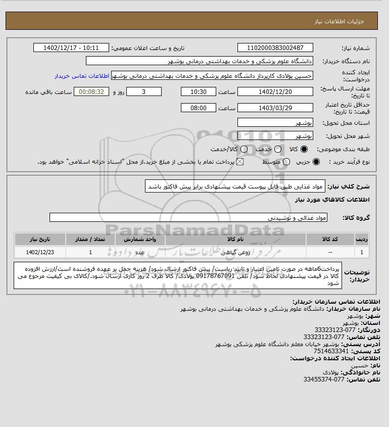 شرح کلی نیاز: مواد غذایی طبق فایل پیوست