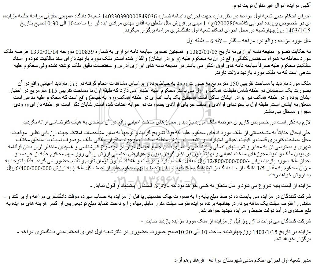 - مزایده در تاریخ 1403/1/15 روزچهارشنبه ساعت 10 الی 10:30صبح بصورت حضوری در دفترشعبه اول اجرای احکام مدنی دادگستری مراغه برگزار خواهد شد