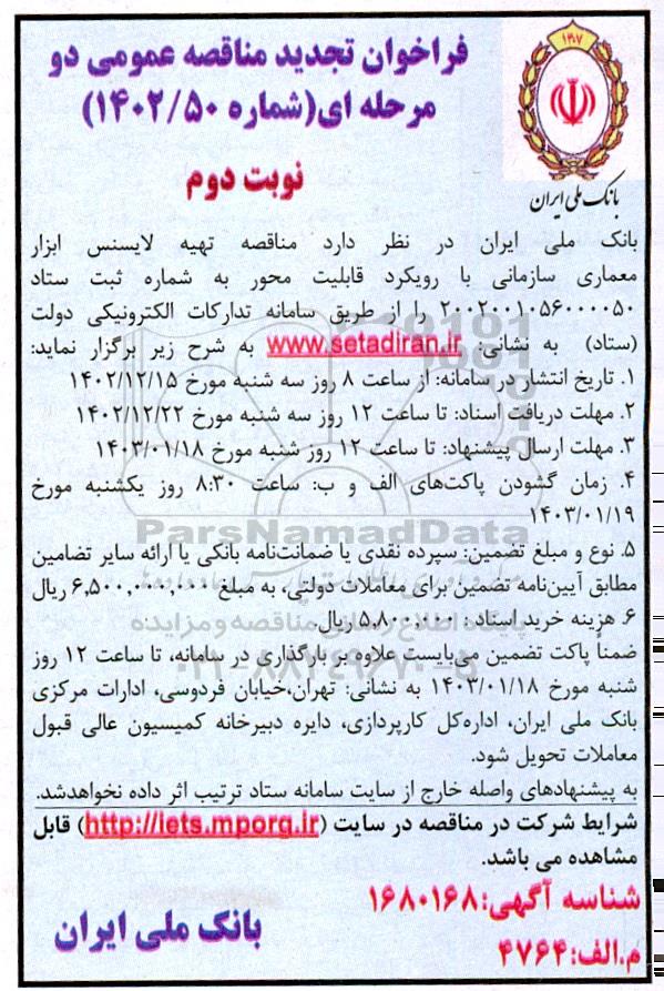 بانک ملی ایران در نظر دارد مناقصه تهیه لایسنس ابزار معماری سازمانی با رویکرد قابلیت محور به شماره ثبت ستاد 2002001056000050 را از طریق سامانه تدارکات الکترونیکی دولت (ستاد) به نشانی ستاد ایران به شرح زیر برگزار نماید