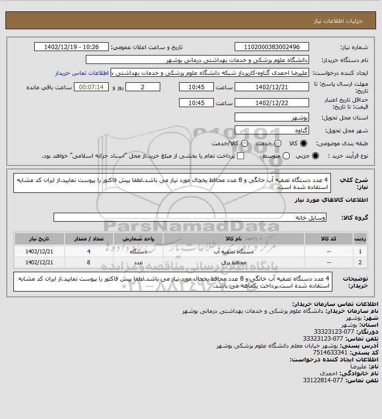 شرح کلی نیاز: 4 عدد دستگاه تصفیه آب خانگی و 8 عدد محافظ یخچال مورد نیاز می باشد.لطفا پیش فاکتور را پیوست نمایید.از ایران کد مشابه استفاده شده است.