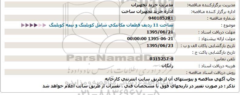 مناقصه ساخت 11 ردیف قطعات مکانیکی شامل کوپلینگ و نیمه کوپلینگ از کلیه افراد متخصص و شرکت‌ها واجد شرایط دعوت به عمل می‌آید در مناقصه با کد خبرگزاری پارس نماد: 717019 شرکت نمایند. این مناقصه در تاریخ 1395/06/08 شروع و مهلت آن تا تاریخ 1395/06/21 میباشد.