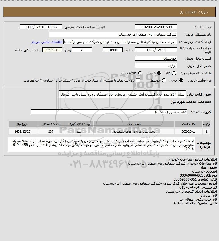 استعلام شارژ 237 عدد انواع کپسول آتش نشانی مربوط به 35 ایستگاه برق و ستاد ناحیه شمال, استعلام شارژ 237 عدد انواع کپسول آتش نشانی مربوط به 35 ایستگاه برق و ستاد ناحیه شمال