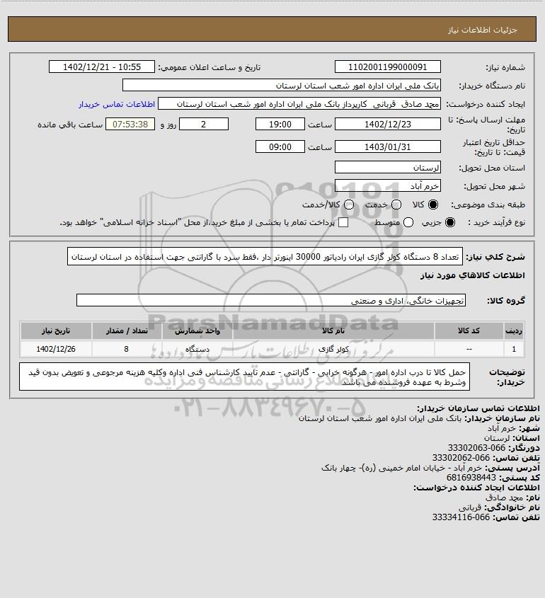 شرح کلی نیاز: تعداد 8 دستگاه کولر گازی ایران رادیاتور 30000 اینورتر دار ،فقط سرد با گارانتی جهت استفاده در استان لرستان