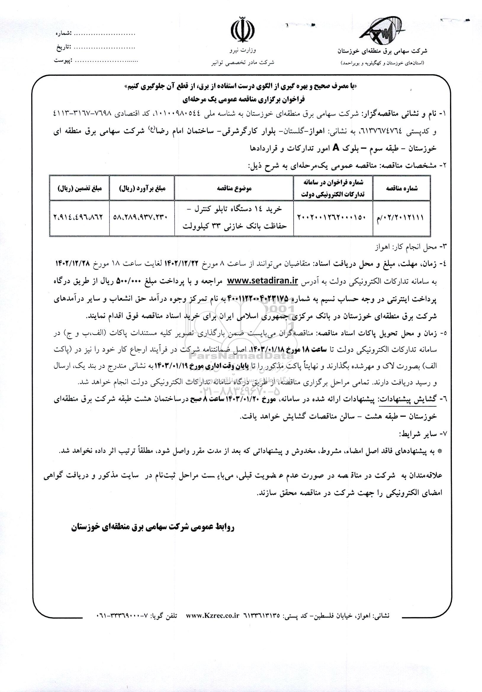 نام و نشانی مناقصه گزار: شرکت سهامی برق منطقه ای خوزستان به شناسه ملی 10100980544 کد اقتصادی 7698-3167-4113 و کدپستی 6137674764 به نشانی اهواز - گلستان - بلوار کارگر شرقی - ساختمان امام رضا (ع) شرکت سهامی برق منطقه ای خوزستان - طبقه سوم - بلوک A امور تدارکات و قراردادها