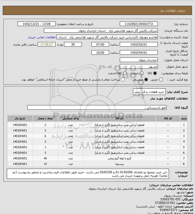 نام دستگاه خریدار:شرکت پالایش گاز شهید هاشمی نژاد استان خراسان رضوی