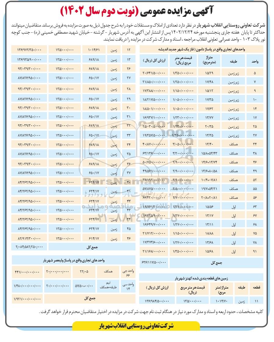 شرکت تعاونی روستایی انقلاب شهریار در نظر دارد تعدادی از املاک و مستغلات خود را به شرح جدول ذیل به صورت مزایده به فروش برساند. متقاضیان می توانند حداکثر تا هفته جاری پنجشنبه مورخه 1402.12.24 پس از انتشار این آگهی به آدرس شهریار - گرشته - خیابان شهید مصطفی خمینی (ره) - جنب کوچه نور پلاک 103 - واحد عمرانی تعاونی انقلاب مراجعه اسناد و مدارک شرکت در مزایده را دریافت نمایند.