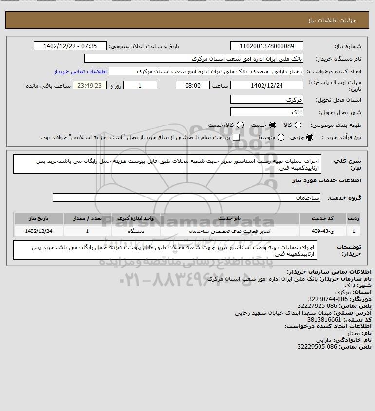 توضیحات خریدار:اجرای عملیات تهیه ونصب اسناسور نفربر جهت شعبه محلات طبق فایل پیوست هزینه حمل رایگان می باشدخرید پس ازتاییدکمیته فنی