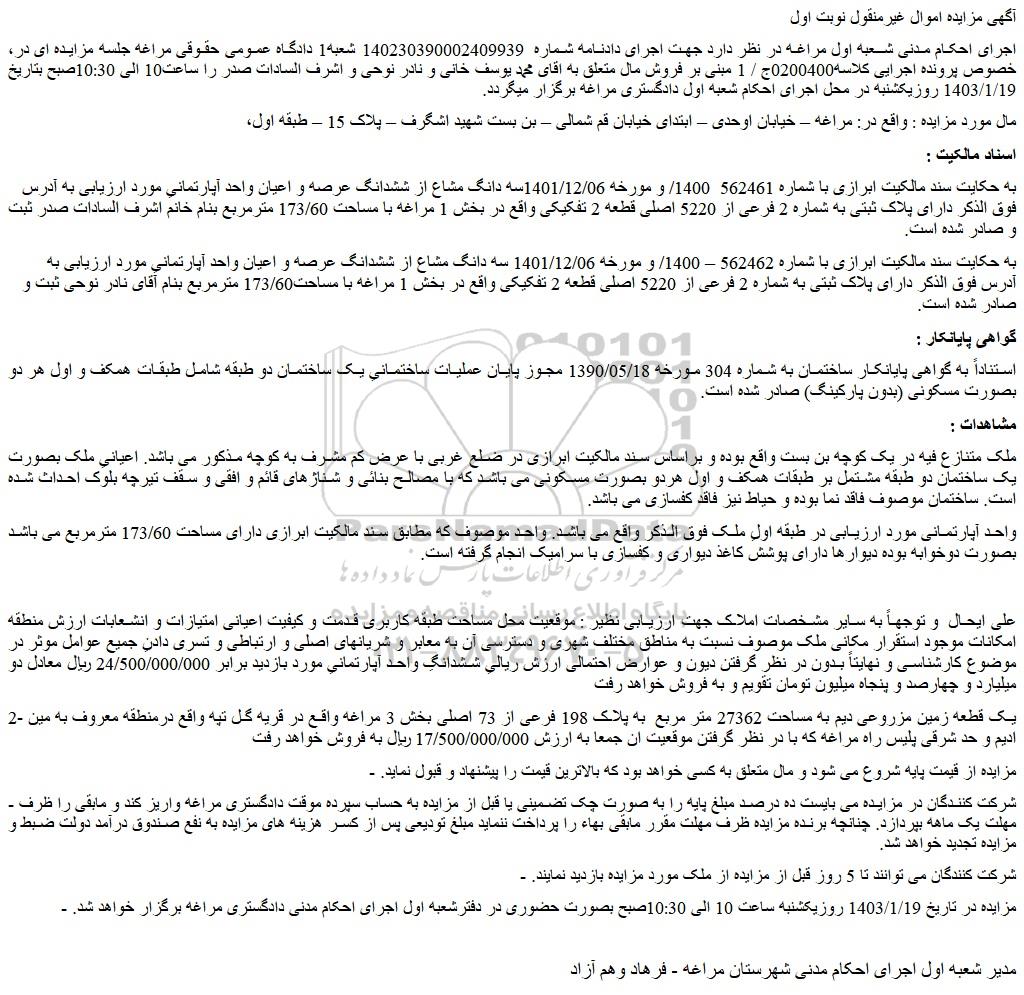 ،اجرای احکام مدنی شعبه اول مراغه در نظر دارد جهت اجرای دادنامه شماره  140230390002409939 شعبه1 دادگاه عمومی حقوقی مراغه جلسه مزایده ای در خصوص پرونده اجرایی کلاسه0200400ج / 1 مبنی بر فروش مال متعلق به اقای محمد یوسف خانی و نادر نوحی و اشرف السادات صدر را ساعت10 الی 10:30صبح بتاریخ 1403/1/19 روزیکشنبه در محل اجرای احکام شعبه اول دادگستری مراغه برگزار میگردد.