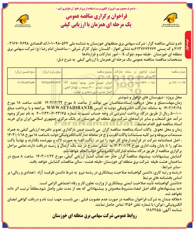 | 02/2011096/ م | 2002001262000151 | اجرای تعویض هادی موجود خطوط 132 کیلوولت شوشتر 400 -دیمچه و شوشتر اصلی اتصال جندی شاپور با هادی پرظرفیت | 43.457.497.324 | 2.172.874.866 |