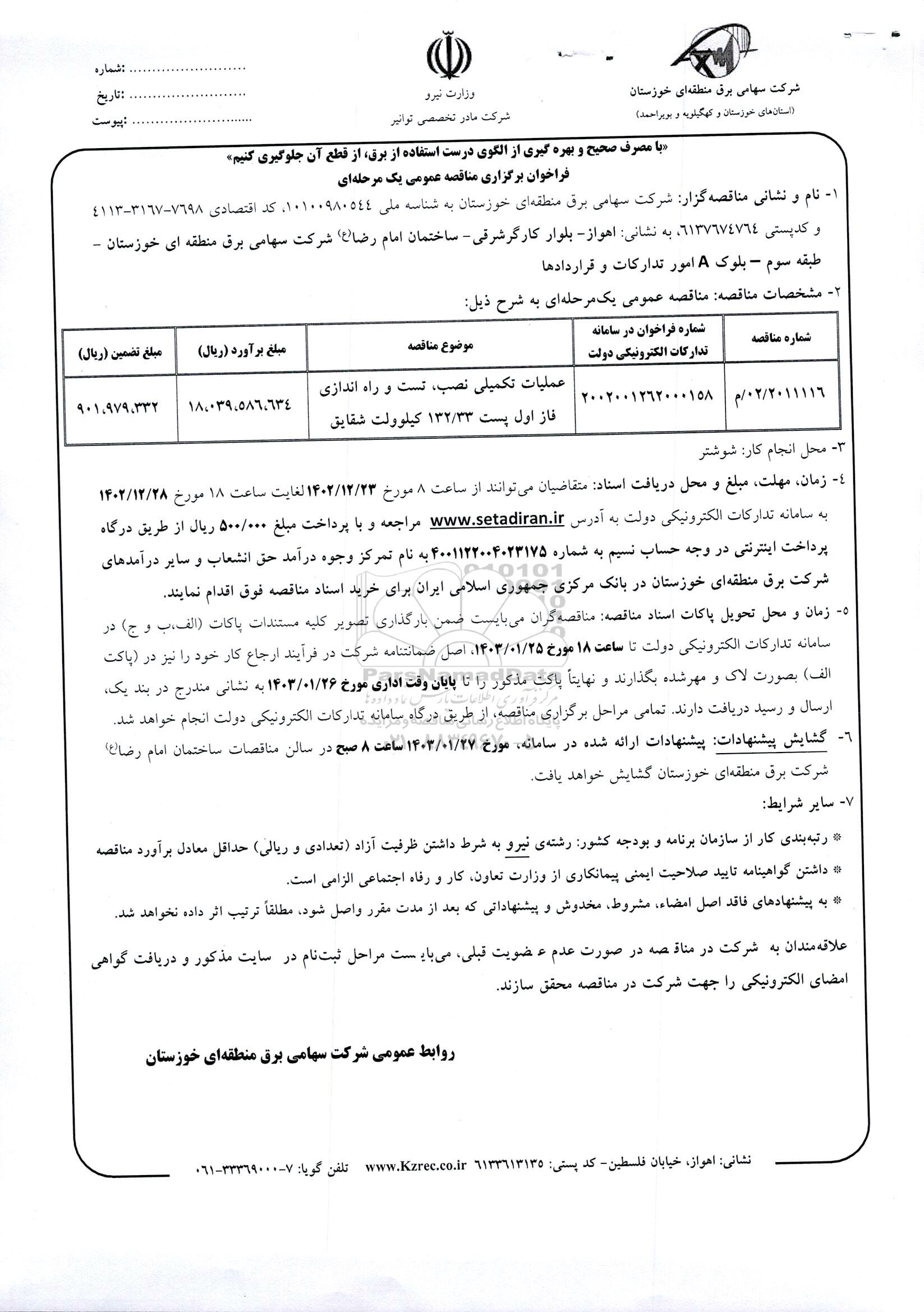 1- نام و نشانی مناقصه گزار: شرکت سهامی برق منطقه ای خوزستان به شناسه ملی 10100980544 کد اقتصادی 7698 - 3167 - 4113 و کد پستی 6137674764 به نشانی: اهواز - بلوار کارگر شرقی - ساختمان امام رضا (ع) شرکت سهامی برق منطقه ای خوزستان - طبقه سوم - بلوک A امور تدارکات و قراردادها