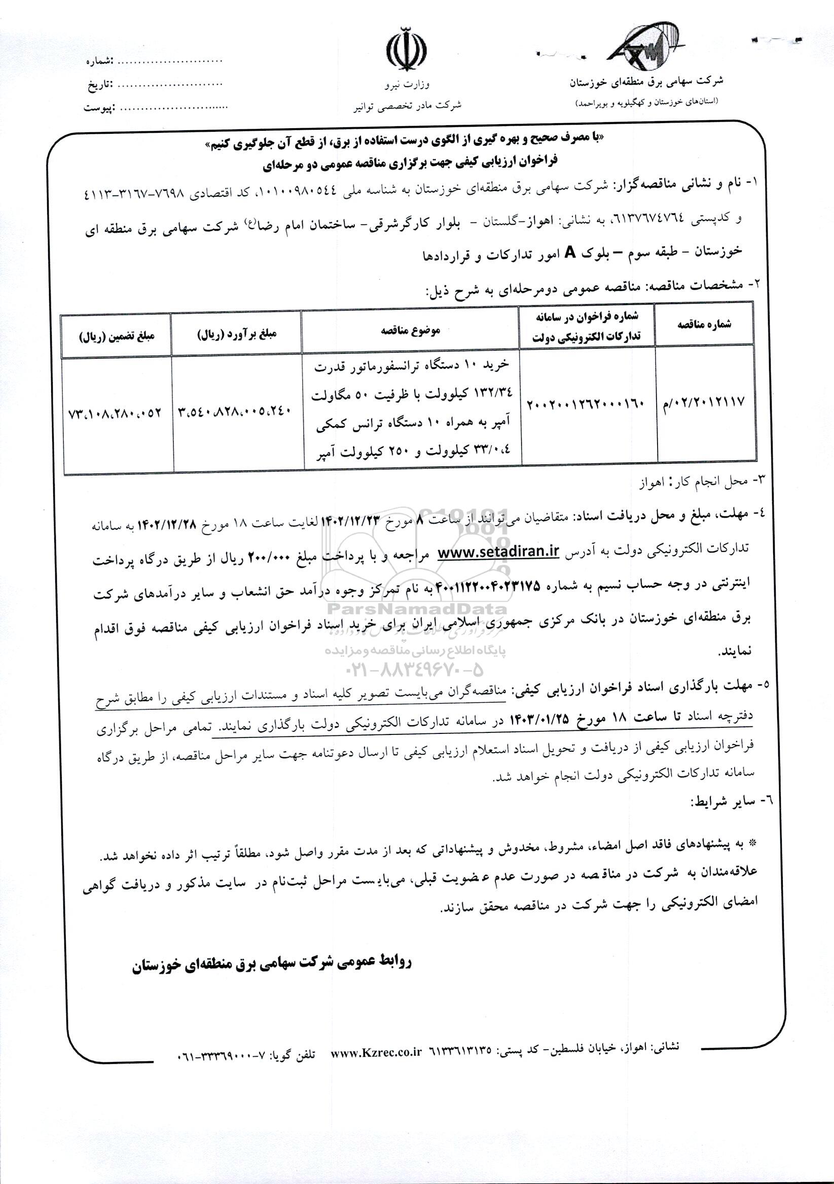 خرید 10 دستگاه ترانسفورماتور قدرت 132.34 کیلوولت با ظرفیت 50 مگاولت آمپر به همراه 10 دستگاه ترانس کمکی 33.04 کیلوولت و 250 کیلوولت آمپر |