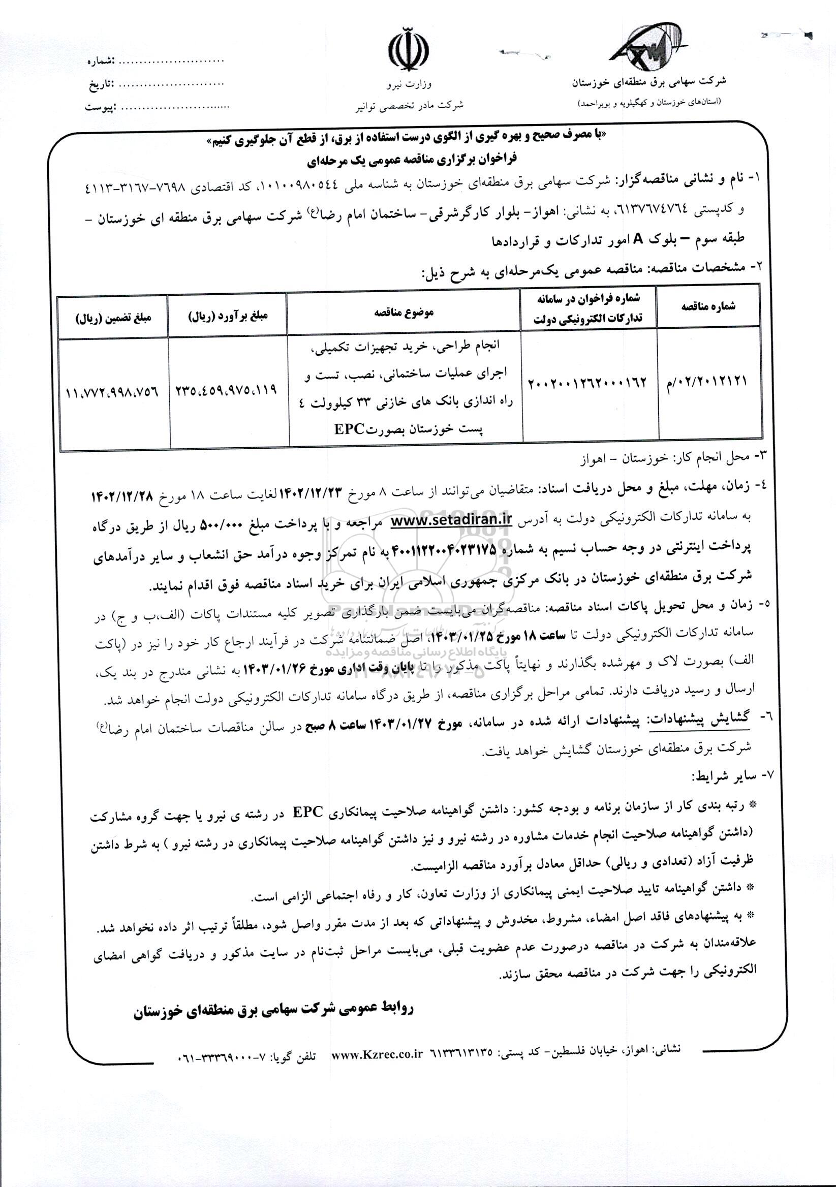 1- نام و نشانی مناقصه گزار: شرکت سهامی برق منطقه ای خوزستان به شناسه ملی 10100980544 کد اقتصادی 7698 - 3167 - 4113 و کد پستی 6137674764 به نشانی: اهواز - بلوار کارگر شرقی - ساختمان امام رضا (ع) شرکت سهامی برق منطقه ای خوزستان - طبقه سوم - بلوک A امور تدارکات و قراردادها