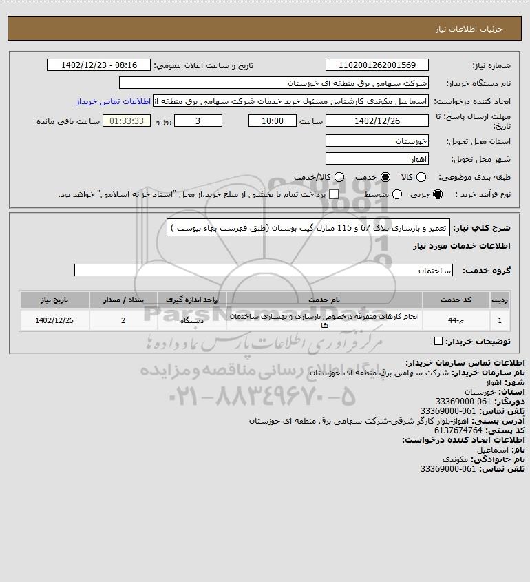 شرح کلی نیاز: تعمیر و بازسازی پلاک 67 و 115 منازل گیت بوستان