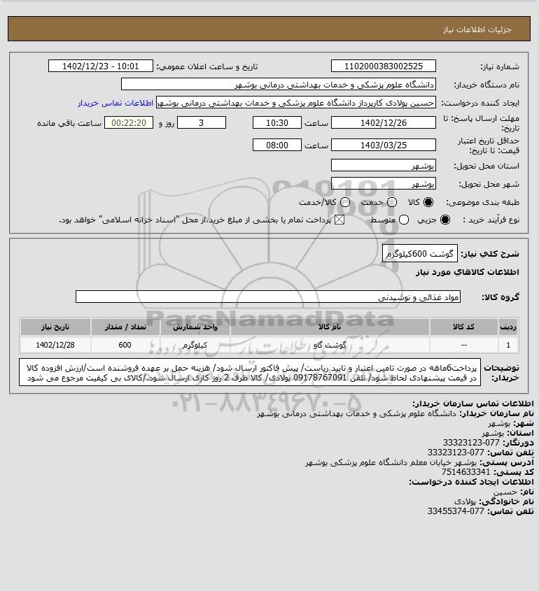 شرح کلی نیاز: گوشت 600کیلوگرم