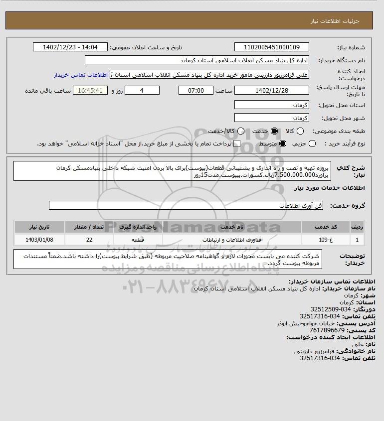 شرح کلی نیاز: پروژه تهیه و نصب و راه اندازی و پشتیبانی قطعات(پیوست)برای بالا بردن امنیت شبکه داخلی بنیادمسکن کرمان برآورد7.500.000.000ریال.کسورات.بپیوست.مدت15روز