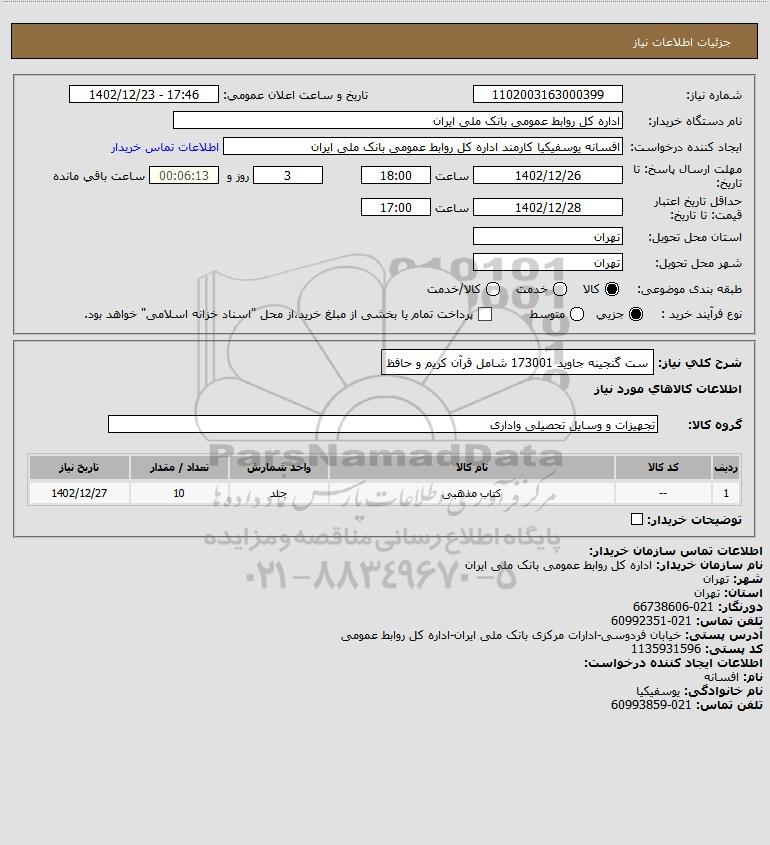 شرح کلی نیاز: ست گنجینه جاوید 173001 شامل قرآن کریم و حافظ
