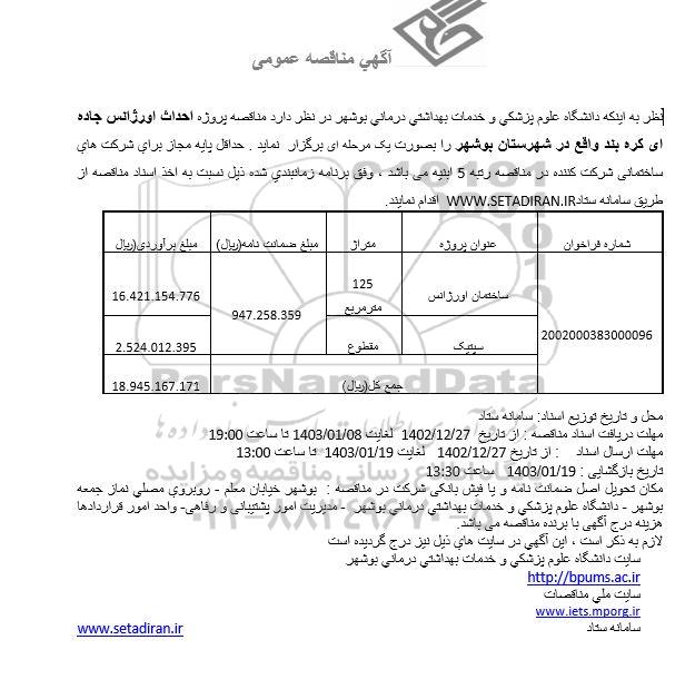 نظر به اینکه دانشگاه علوم پزشکی و خدمات بهداشتی درمانی بوشهر در نظر دارد مناقصه پروژه احداث اورژانس جاده ای کره بند واقع در شهرستان بوشهر را بصورت یک مرحله ای برگزار نماید. حداقل پایه مجاز برای شرکتهای ساختمانی شرکت کننده در مناقصه رتبه 5 ابنیه می باشد ، وفق برنامه زمانبندی شده ذیل نسبت به اخذ اسناد مناقصه از طریق سامانه ستاد ستاد ایران اقدام نمایند.