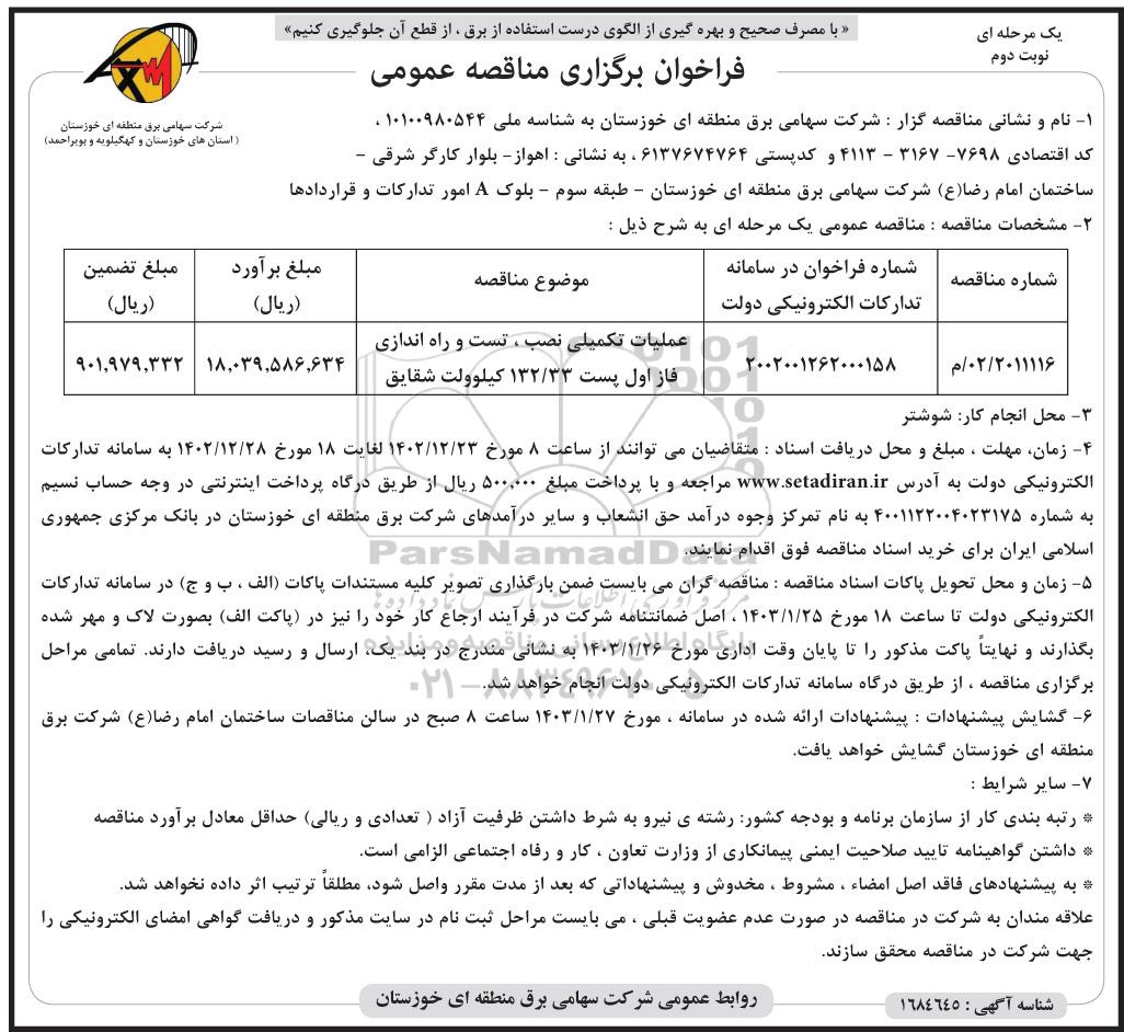 مناقصه عملیات تکمیلی نصب ، تست و راه اندازی فاز اول- نوبت دوم از کلیه افراد متخصص و شرکتها واجد شرایط دعوت به عمل میآید در مناقصه با کد خبرگزاری پارس نماد: 7196116 شرکت نمایند.