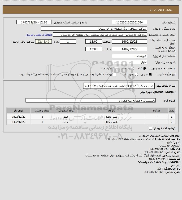 شرح کلی نیاز: شیر خودکار (یکطرفه) 8 اینچ - شیر خودکار (یکطرفه) 4 اینچ