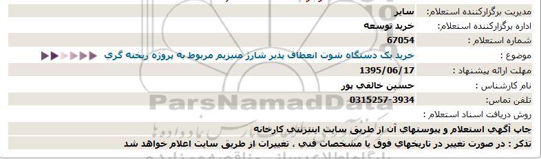 استعلام بها و موضوع استعلام استعلام , استعلام خرید یکدستگاه شوت انعطاف پذیر شارژ منیزیم مربوط به پروژه ریخته گری به اطلاع کلیه شرکتها و افراد متخصص واجد شرایط میرساند، آگهی گذار در نظر دارد از طریق استعلام بها، نسبت به انتخاب و دریافت پیشنهادات اقدام نماید. این استعلام با کد آگهی ثبت شده در سامانه خبرگزاری پارس نماد : 719948 منتشر شده است. مشخصات استعلام : تاریخ شروع استعلام: 1395/06/14 آخرین مهلت ارسال پیشنهاد قیمت : 1395/06/17 و محل اجرای پروژه : استان اصفهان میباشد. استعلام قیمت مورد درخواست : استعلام , استعلام خرید یکدستگاه شوت انعطاف پذیر شارژ منیزیم مربوط به پروژه ریخته گری با دستهبندیهای تخصصی و گروه های مرتبط : تجهیزات و ماشین آلات صنعتی, استعلام اطلاع رسانی میگردد.