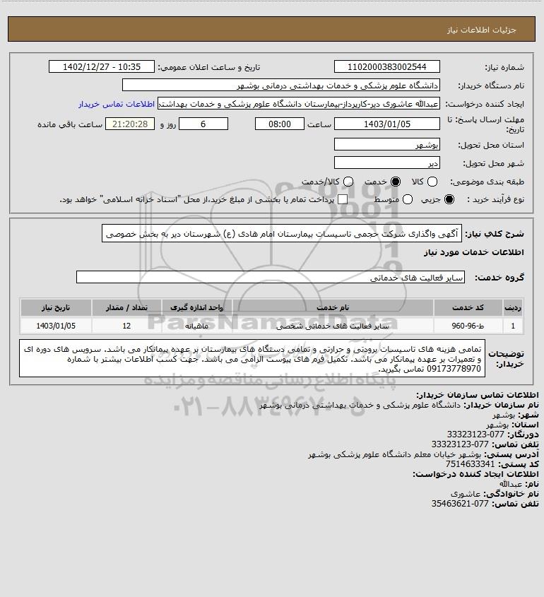 شرح کلی نیاز: آگهی واگذاری شرکت حجمی تاسیسات بیمارستان امام هادی (ع) شهرستان دیر به بخش خصوصی