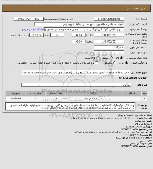 شرح کلی نیاز: لامپ uv lump مربوط به آنالایزر o3-یک عدد (بشرح پیوست)اطلاعات فنی :آقای حاج علیزاده 09133783688