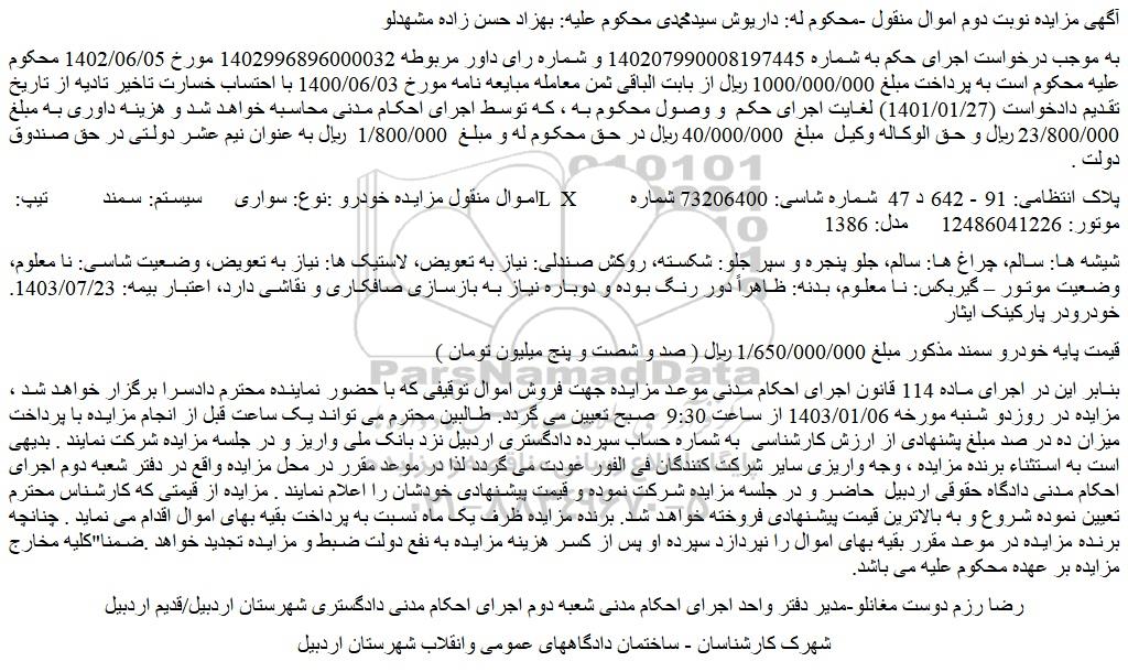 آگهی مزایده نوبت دوم اموال منقول -محکوم له: داریوش سیدمحمدی محکوم علیه: بهزاد حسن زاده مشهدلو