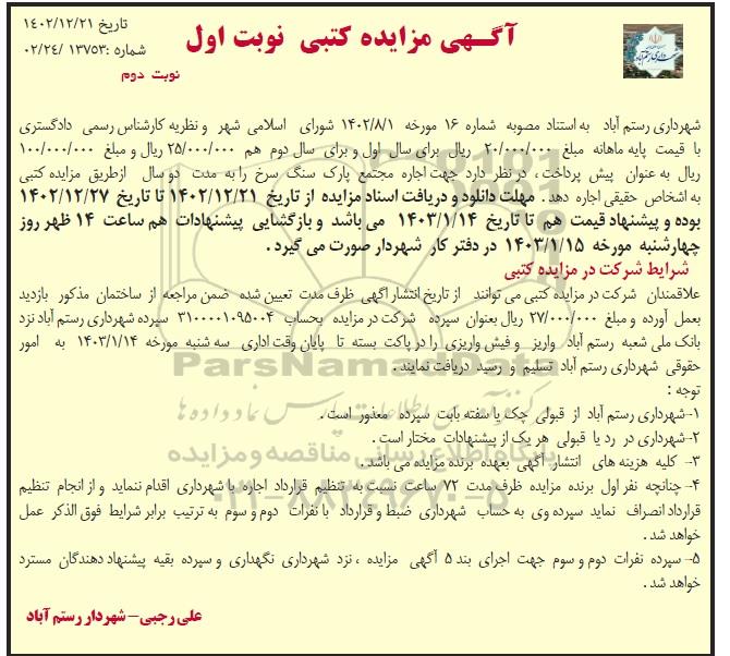 شهرداری رستم آباد به استناد مصوبه شماره 16 مورخه 1402.8.1 شورای اسلامی شهر و نظریه کارشناس رسمی دادگستری با قیمت پایه ماهانه مبلغ 20.000.000 ریال برای سال اول و برای سال دوم هم 25.000.000 ریال و مبلغ 100.000.000 ریال به عنوان پیش پرداخت، در نظر دارد جهت اجاره مجتمع پارک سنگ سرخ را به مدت دو سال از طریق مزایده کتبی به اشخاص حقیقی اجاره دهد. مهلت دانلود و دریافت اسناد مزایده از تاریخ 1402.12.21 تا تاریخ 1402.12.27 بوده و پیشنهاد قیمت هم تا تاریخ 1403.1.14 میباشد و بازگشایی پیشنهادات هم ساعت 14 ظهر روز چهارشنبه مورخه 1403.1.15 در دفتر کار شهردار صورت می گیرد.
