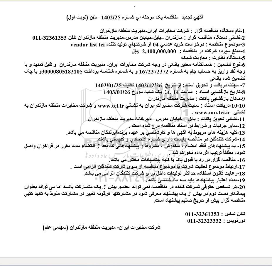 1- نام دستگاه مناقصه گزار : شرکت مخابرات ایران - مدیریت منطقه مازندران