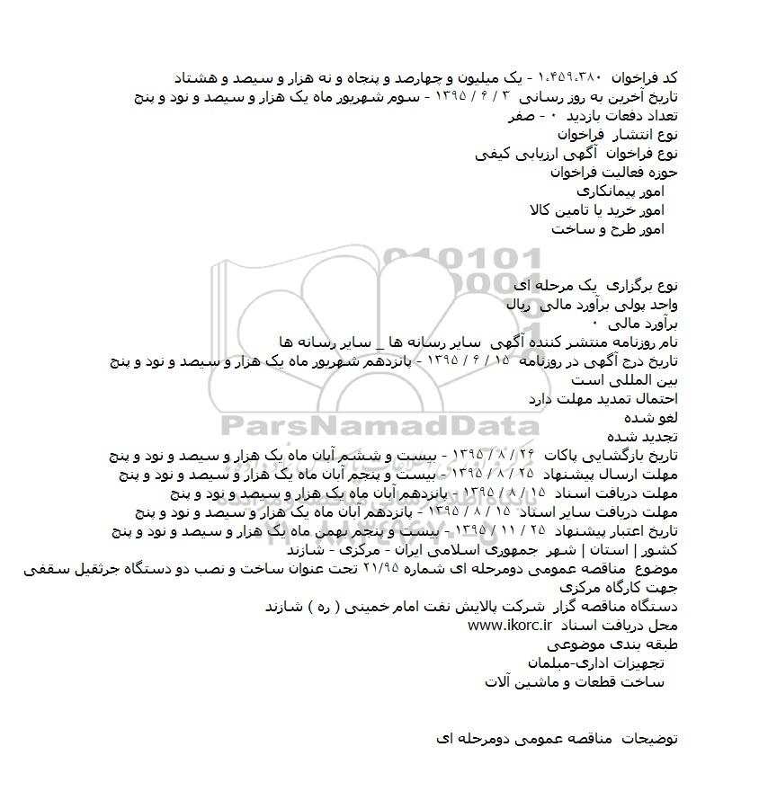 مهلت دریافت اسناد ۱۵ / ۸ / ۱۳۹۵ - پانزدهم آبان ماه یک هزار و سیصد و نود و پنج