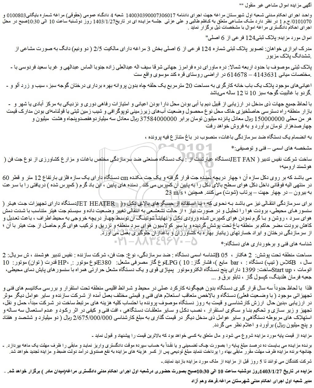 - مزایده در تاریخ 1403/1/27روز دوشنبه ساعت 10 الی 10:30صبح بصورت حضوری درشعبه اول اجرای احکام مدنی دادگستری مراغه(میدان مادر ) برگزار خواهد شد.