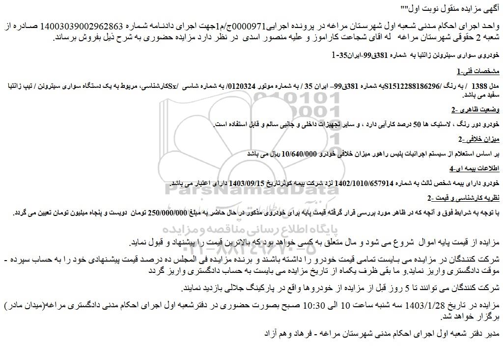 مزایده در تاریخ 1403/1/28 سه شنبه ساعت 10 الی 10:30 صبح بصورت حضوری در دفترشعبه اول اجرای احکام مدنی دادگستری مراغه(میدان مادر) برگزار خواهد شد.