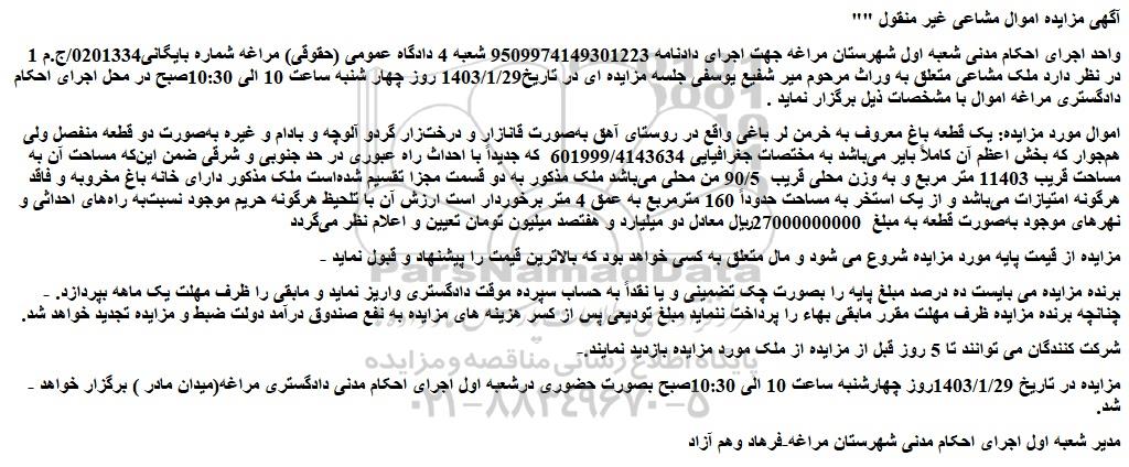 - مزایده در تاریخ 1403/1/29روز چهارشنبه ساعت 10 الی 10:30صبح بصورت حضوری درشعبه اول اجرای احکام مدنی دادگستری مراغه(میدان مادر ) برگزار خواهد شد.